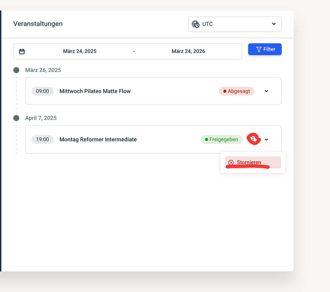 Bis 24h vor Kursbeginnn kannst du über folgende Seite stornieren: MEINE KURSE.
